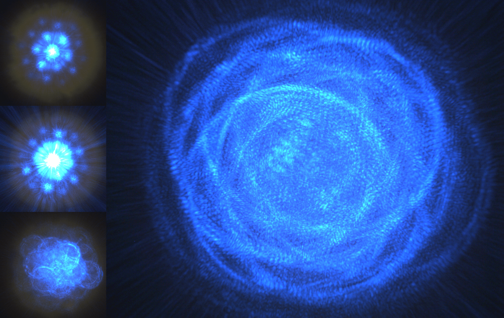 Intereference pattern of blue laser light from multiple cores of a bespoke optical fibre. Each core has been acid etched, forming a concave pit. Each concave pit acts somewhat like a lens. The far end of the fibre is illuminated with a laser source over multiple cores. The light exiting the end of the fibre spreads out due to the lensing, and light from multiple cores interferes to form a complex pattern. In the images, when focused on the fibre end (top left) light is seen exiting the cores. When focus is backed away from the fibre (progressing down images and to main image) light is seen to spread out from the cores until the far field interference pattern is observed in the main image.